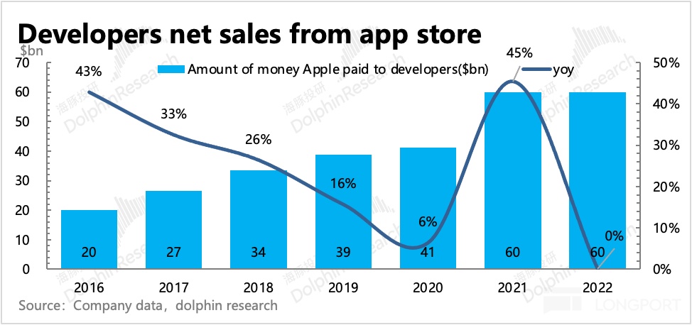 但回溯过去十年,无论是苹果官方披露的支付给开发者的分成,还是Sensor Tower跟踪的流水数据,都能明显看出,近几年App Store的流水增长越来越吃力。