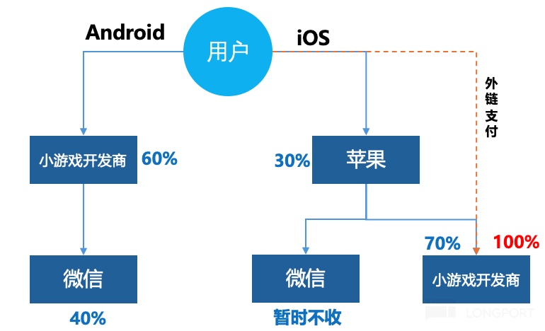 也就是说,在iOS端的微信小游戏中,微信作为提供基础技术、推广分发的生态平台,应得的那部分“辛苦费”实际上被苹果拿去了。