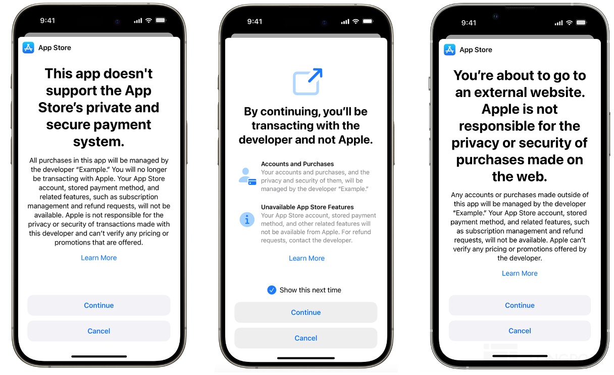 b. 开发者可以选择Apple pay以外的支付服务商实现App内付费,或者是通过链接跳转到外部网页进行付费,但均需要向Apple申请Storekit外部购买、外部链接购买的授权。此外,开发商需要另外配置技术模块,同时需要对用户发起“非Apple Pay交易的安全提醒”。