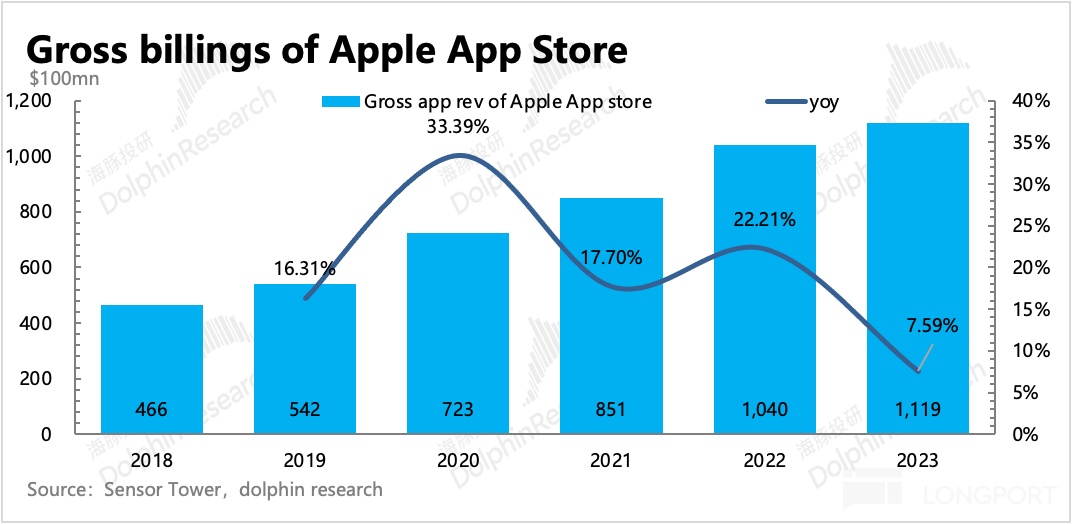 上述不同来源的收入可能存在出入,为保持数据连贯性,海豚君以下讨论主要采取结合苹果支付给开发者的净销售额数据、Sensor Tower以及投行估算的数据,作为分析依据。