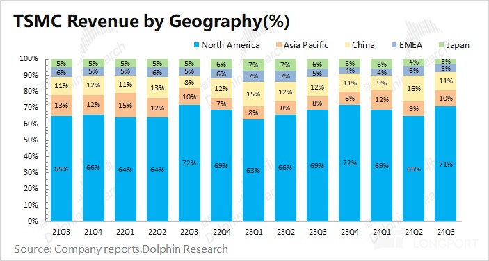 3、晶圆结构端:先进制程需求旺盛。公司本季度的增长主要来自于苹果新机和高性能计算的拉动。其中本次苹果新机 iPhone16 全系列搭载 3nm 芯片,带动本季度 3nm 收入占比提升至 20%。当前公司7nm 以下的收入占比已经达到了 69%,先进制程旺盛的需求推动公司业绩继续上行。在苹果和英伟达等客户的带动下,公司本季度北美地区收入占比提升至 71%。