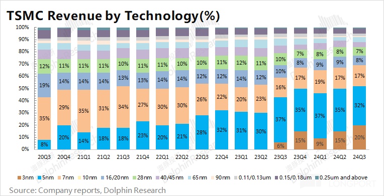 本季度 7nm 以下的收入占比继续提升至 69%,先进制程端的收入已经是公司的核心来源。具体来看,本季度公司 3nm 收入占比提升至 20%,而 5nm 的收入占比略有下滑至 32%。
