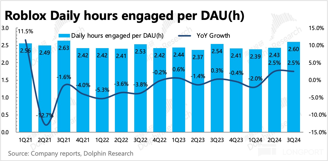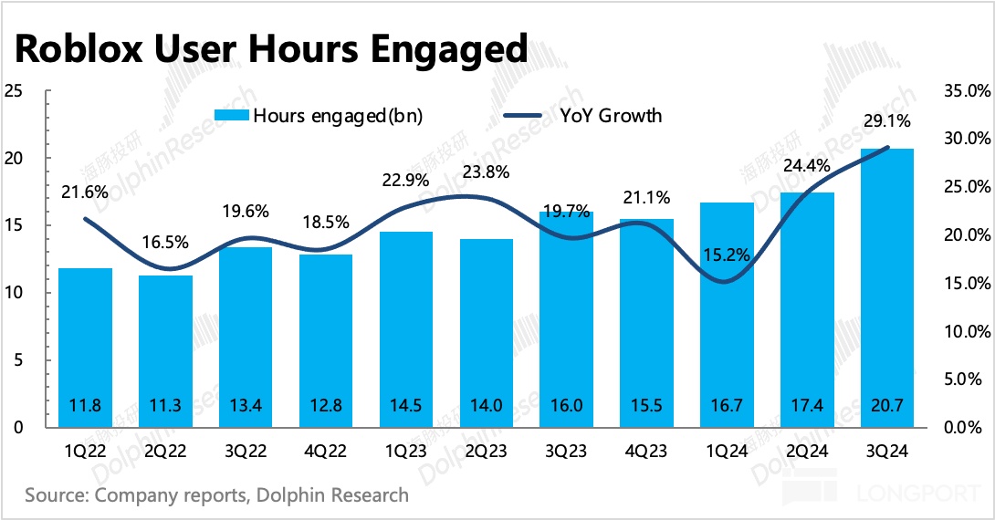1. 平台活跃度新高:今年的 Roblox 举办的机场 Live-ops 活动效果都不错,上季度凭借 “The Hunt”、“The Classic”,DAU 在淡季逆势走高。而三季度有贴合奥运主题的 “The Games”,再加上本身又是旺季,最终带动平台活跃度来到历史新高的水平。具体指标上,DAU 净增 940 万,用户总时长达到 207 亿小时,同比增长 29%,两个指标都环比加速。