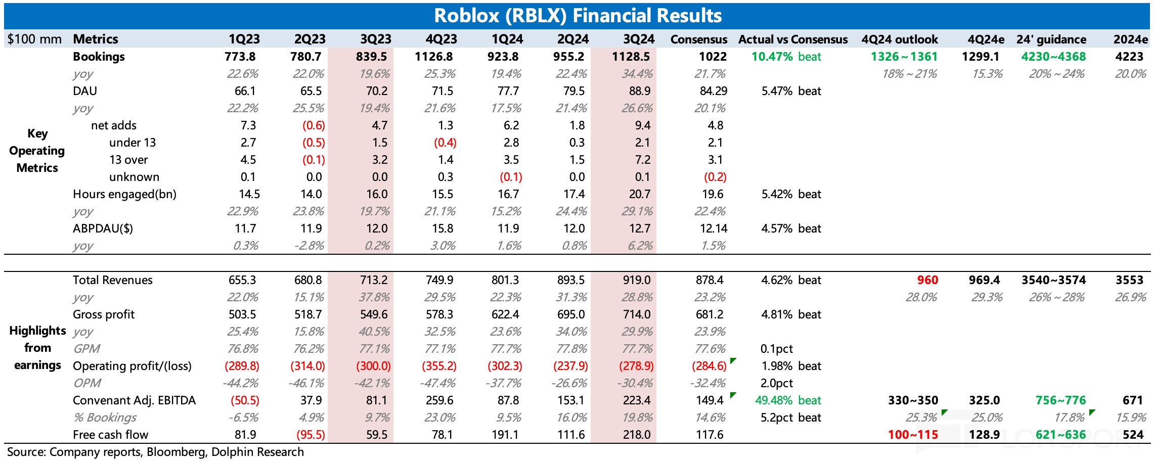 3. Bookings 继续加速反弹:三季度预订流水同比增速反弹到 34%,显著超市场预期的 22%。相比二季度,三季度 Bookings 的增幅要明显高于流量,结合第 2 点,原因也很简单,青年/成年用户的付费力显然要远高于儿童用户。因此当三季度青年和成年用户为增长主力时,自然能带来更明显的流水增加。