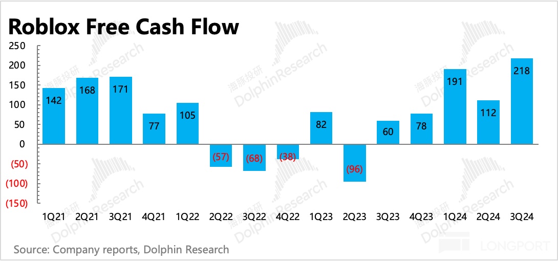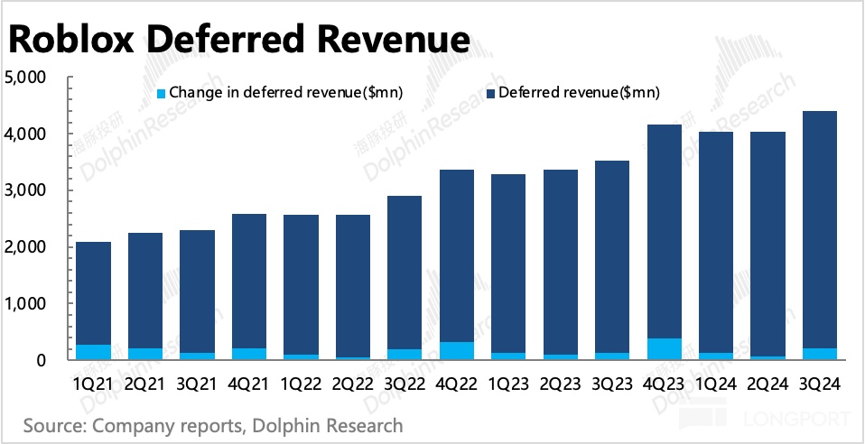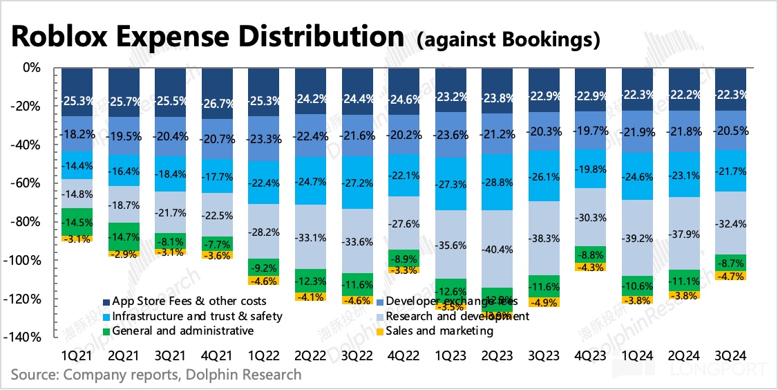 1)开发者分成费用是基于流水分成当期直接给到开发者,但三季度新增流水中,当期就确认收入的比重要低于往期水平,因此这里造成了财务上的收入支出错配;海豚君在《Roblox:吞不了元宇宙的 “大饼”》中重点提及过 Roblox 确认收入和成本费用的方式,因此从 “费用/Bookings” 的角度来看费率变化更贴合实际经营情况。