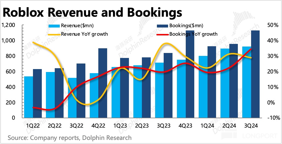 而三季度以来,Sensor Tower 数据也显示 Roblox 的平台活跃度增长趋势还不错,因此三季度业绩表现,市场也是有一定预期的。但市场没有想到的是,实际表现会显著超出原先的指引,带来 Bookings 增速进一步反弹。与此同时,下季度的指引同样隐含了基数变高下,增速还能维持在 20% 左右的高成长趋势。