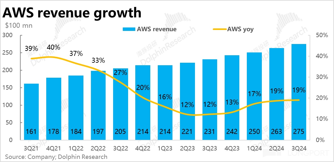 本季度 AWS 的营收同比增速为 19.1%,相比上季仅提速 0.4pct,相比卖方一致预期反略低 0.1pct。而据海豚投研了解,头部卖方和买方期待的至少是 20% 或以上的增速,来验证 AWS 重新加速并缩窄与同行差距的趋势。但从本季财报来看并不如人愿。