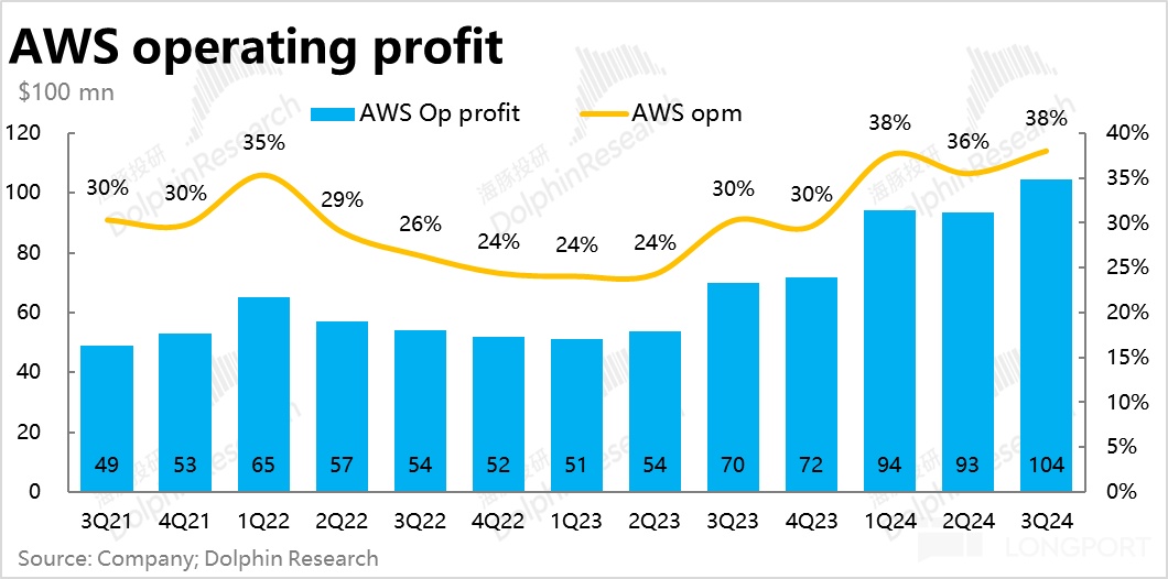 但是利润方面,AWS 的经营利润率则有明显的拉升,环比提升近 2pct 到 38%,追平了折旧期限延长红利刚刚释放时一季度的利润率。实际经营利润近 105 亿美元,大幅高出预期的 91 亿。