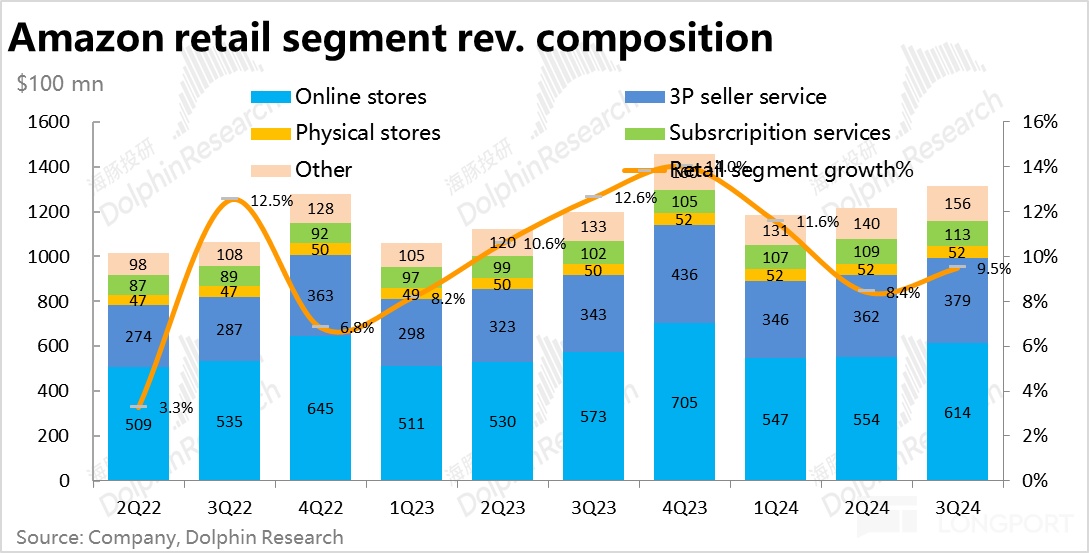 零售板块本季度的营收增速为 9.5%,相比上季度略微 1.1pct,略强于市场预期 1.2%。结合行业数据显示美国地区的线上零售整体增速相比上季度是略降的,实际表现确实是比预期略好些。
