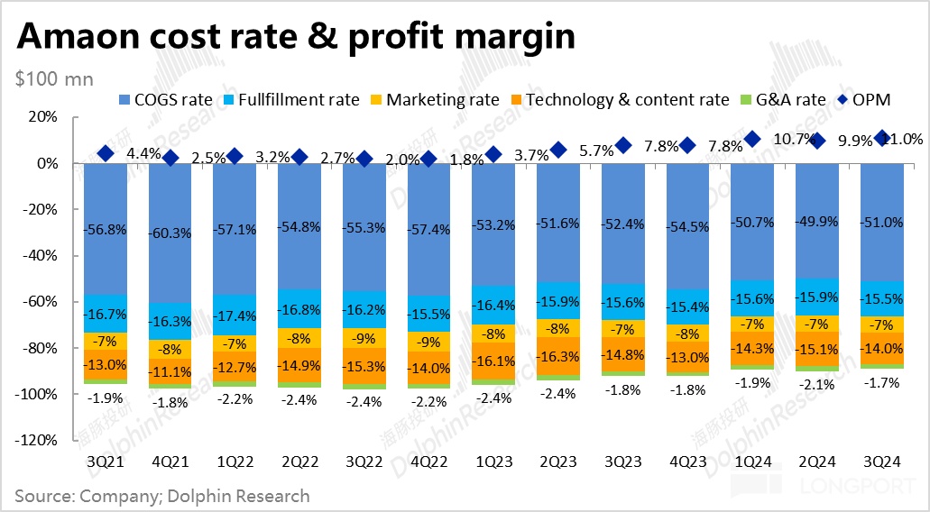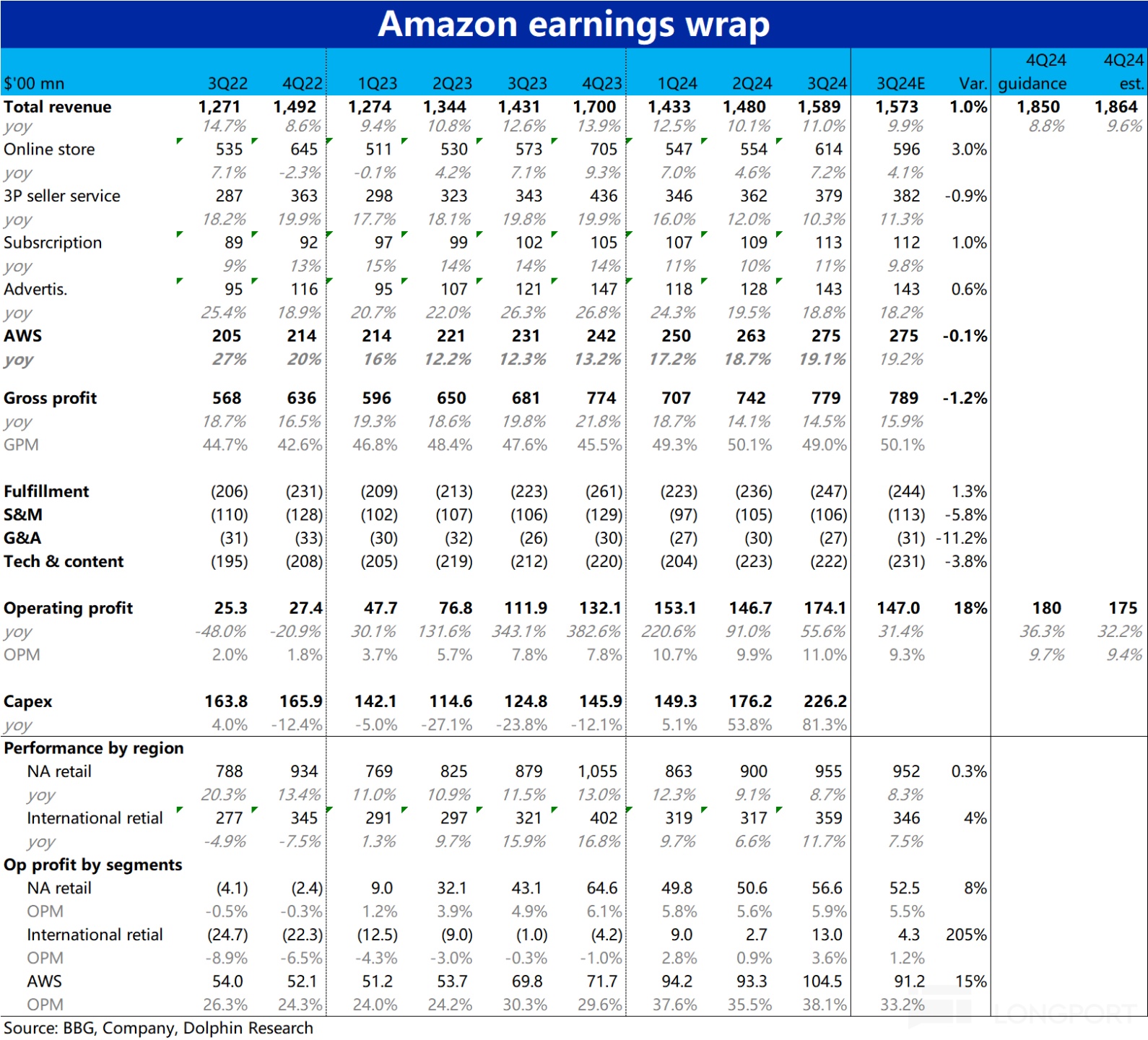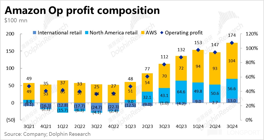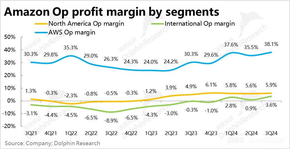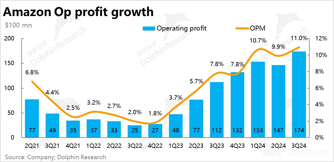 由于 AWS 和国际零售板块的贡献,亚马逊整体经营利润达 174 亿美元,远超卖方预期的 147 亿,和先前指引上限的 150 亿。整体经营利润率为 11%,环比拉高 1.1pct,重新确立了利润率扩张的趋势。