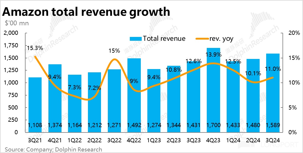 加总云业务和零售业务,亚马逊本季实现总营收约 1589 亿美元,同比增长 11%,略有提速。比市场预期的 1573 亿稍高,主要还算源自国际地区零售增长超预期的贡献。