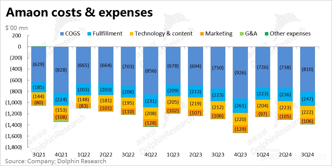 成本和费用的角度:1)本季的毛利率为 49.1%,略低于预期的 50.1%。海豚投研认为,可能部分是因为 3P 商家服务和广告收入这些相对高毛利业务的本季增长相对滑坡导致的。