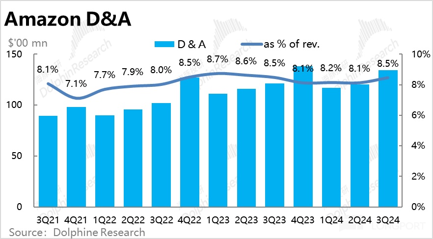 据我们了解市场原本的预期是,随着折旧期限延长的红利逐渐退坡 & AWS 进入 Capex 加大周期,AWS 的经营利润率会逐步向原先水平回归(市场一致预期为 33%)。但在营收并没大幅提速的情况下,盈利却明显改善着实是在预料之外,需重点关注管理层是如何解释利润率上升的驱动因素。