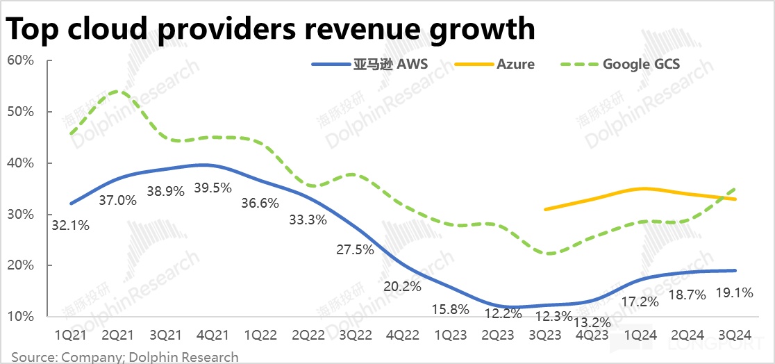 市场关注的重点之一,即在这轮 AI 浪潮中明显跑输的 AWS,何时/能否缩窄于 AWS 和 GCP 的增速差距。