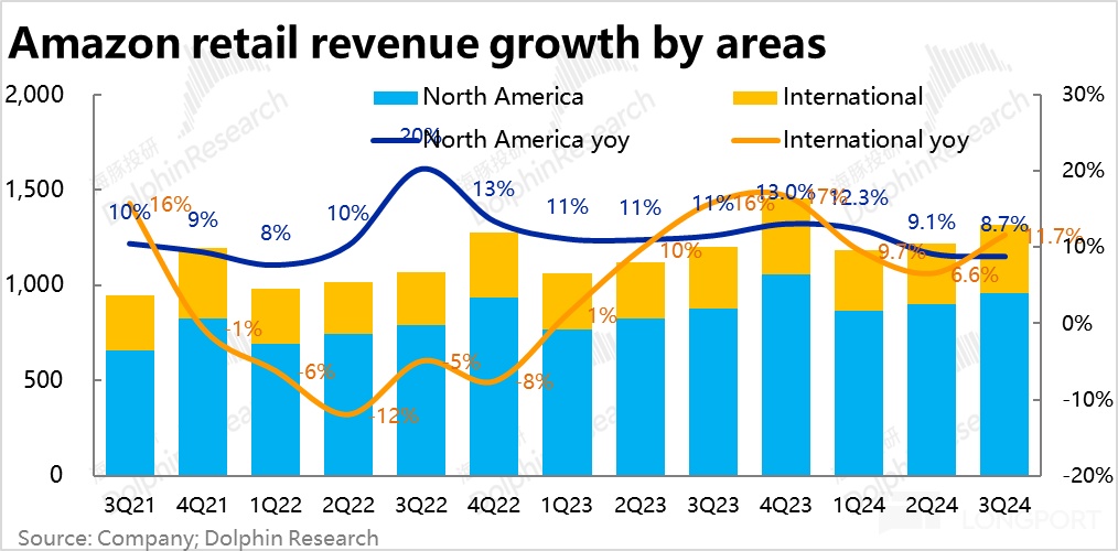 2、 零售板块本季度的营收增速为 9.5%,相比上季度略微 1.1pct,略强于市场预期 1.2%。分地区看,北美零售的增速确实是如高频数据展示的略有放缓,从 9.1% 略降到 8.7%。而国际零售业务的名义增速从 6.6% 大幅提速到了 11.7%,是主要亮点。不过其中近 3pct 的增速变化是来自汇率的贡献。