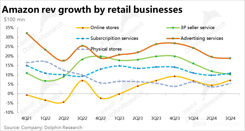 具体业务上,3P 商家服务和广告收入的增长略有放缓,而自营零售的增长则有不小的提速。结合官方公布的 3P 商家订单量占比从上季的 61% 下滑到了 60%,应当主要是 1P 和 3P 销量结构的比重变化导致的增速边际变化。另外,订阅服务收入的增速也提升了 1.1pct,应当有 Prime video ads 的贡献。