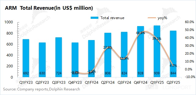 ARM 在 2025 财年第二季度(即 24Q3)实现营收 8.44 亿美元,同比上升 4.7%,略好于市场预期(8.1 亿美元)。公司本季收入继续提升,虽然许可证业务本季度有所下滑,但公司仍受益于版税业务的快速增长。