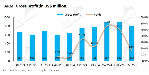 ARM 在 2025 财年第二季度(即 24Q3)实现毛利 8.12 亿美元,同比增长 6.8%。毛利端同比增速略高于收入端。