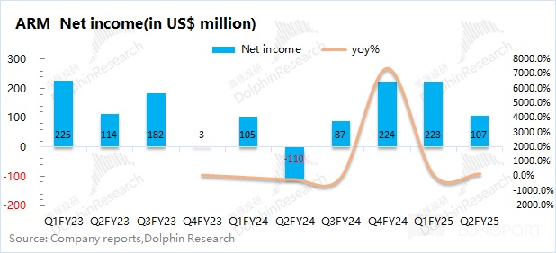 ARM 在 2025 财年第二季度(即 24Q3)实现净利润 1.07 亿美元,同比扭亏为盈,符合市场预期(1.07 亿美元)。本季度净利率 12.7%。