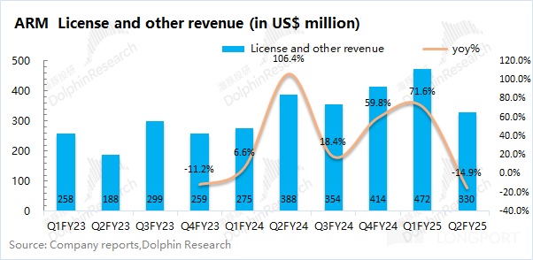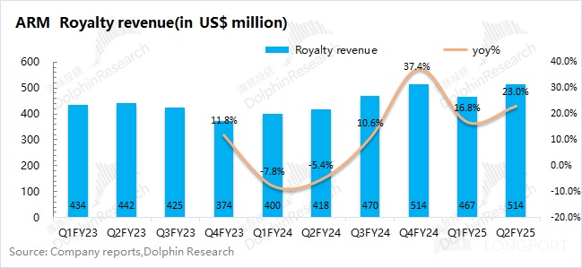 ARM 的版税授权业务在 2025 财年第二季度(即 24Q3)实现营收 5.14 亿美元,同比增长 23%。版税授权业务的增长,主要得益于智能手机的贡献。
