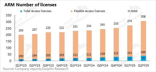 ARM 的许可证业务在 2025 财年第二季度(即 24Q3)实现营收 3.3 亿美元,同比下滑 14.9%,在公司本次财报中,年度合同价值和未履约部分环比都在增长,公司许可证业务仍然是向上。而本季度的下滑,主要是受季度收入确认等影响。