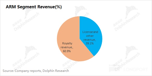 2、各业务细分:版税业务创新高。虽然公司本季度许可证收入有所下滑,但$Arm(ARM.US) 的客户总数依旧在增加,年度及未履约的合同仍保持增长。版税授权业务,是本季度最主要的增量,主要得益于手机客户的收入达到同比 40% 的增长,远好于个位数增长的全球手机市场出货量。此外,公司在汽车和云服务的份额在本季度继续上升。