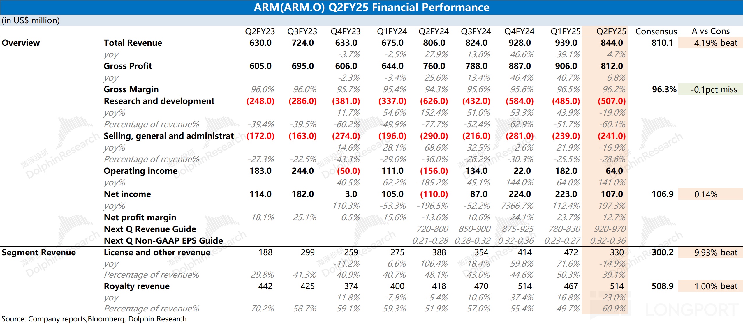 一、整体业绩:收入&利润,都达到市场预期。ARM 在 2025 财年第二季度(即 24Q3)实现营收 8.44 亿美元,同比增长 4.7%,略好于市场预期(8.1 亿美元)。本季度收入端的增长,主要得益于版税业务快速增长的拉动;公司本季度毛利率 96.2%,同比提升 1.9pct,符合市场预期(96.3%),维持在 96% 上方。