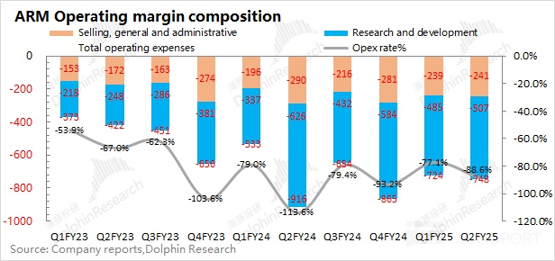 如果单纯看经营面情况,公司本季度经营性利润环比提升至 0.64 亿美元,同比转正。虽然 ARM 有着超高的毛利率,但由于公司主要都投向了研发等费用端。即使公司有 96% 的毛利率,近 60% 的研发费用率,直接挤压了公司最终的利润。