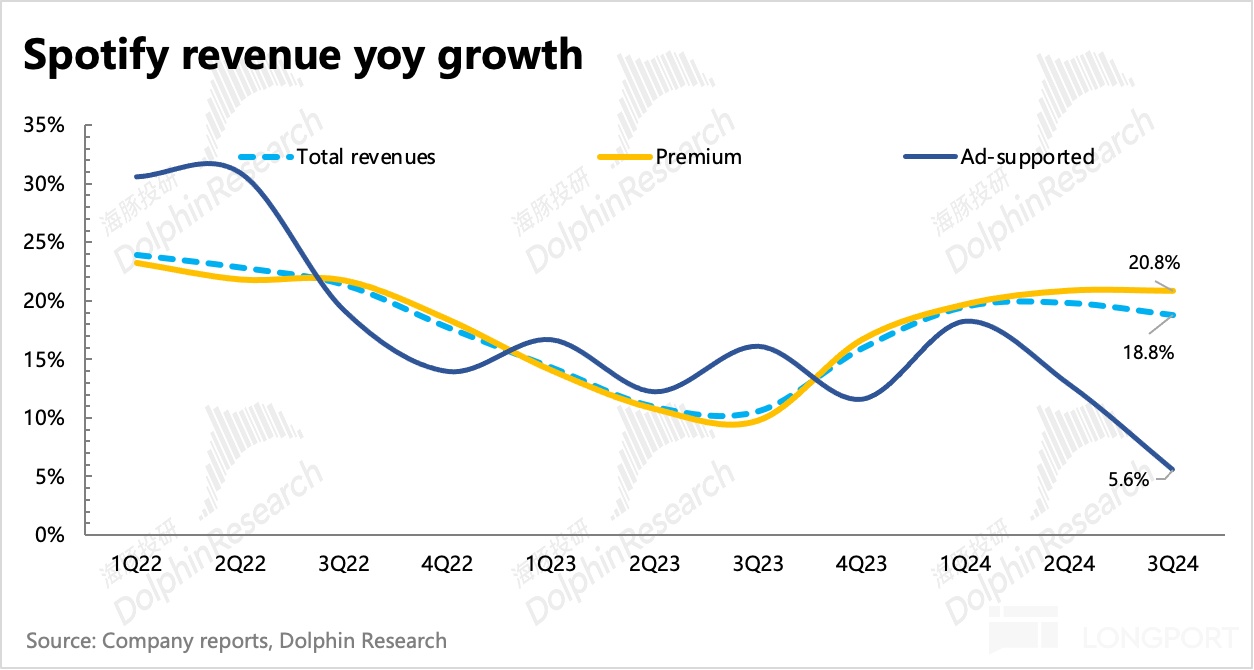 收入表现上,免费广告用户和付费用户的增长差异,带来了不同业务增长趋势的差异。再加上涨价的拉动,订阅收入在三季度的增长维持稳定在 21%,但广告收入则继上季度放缓后,本季度只有 5.6% 的增速了。
