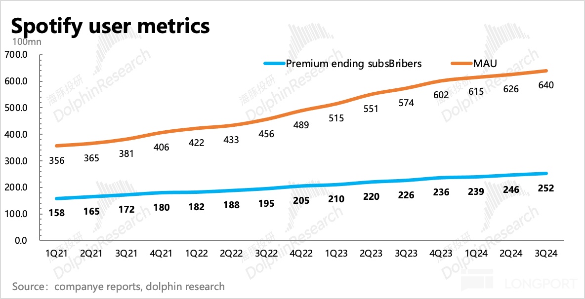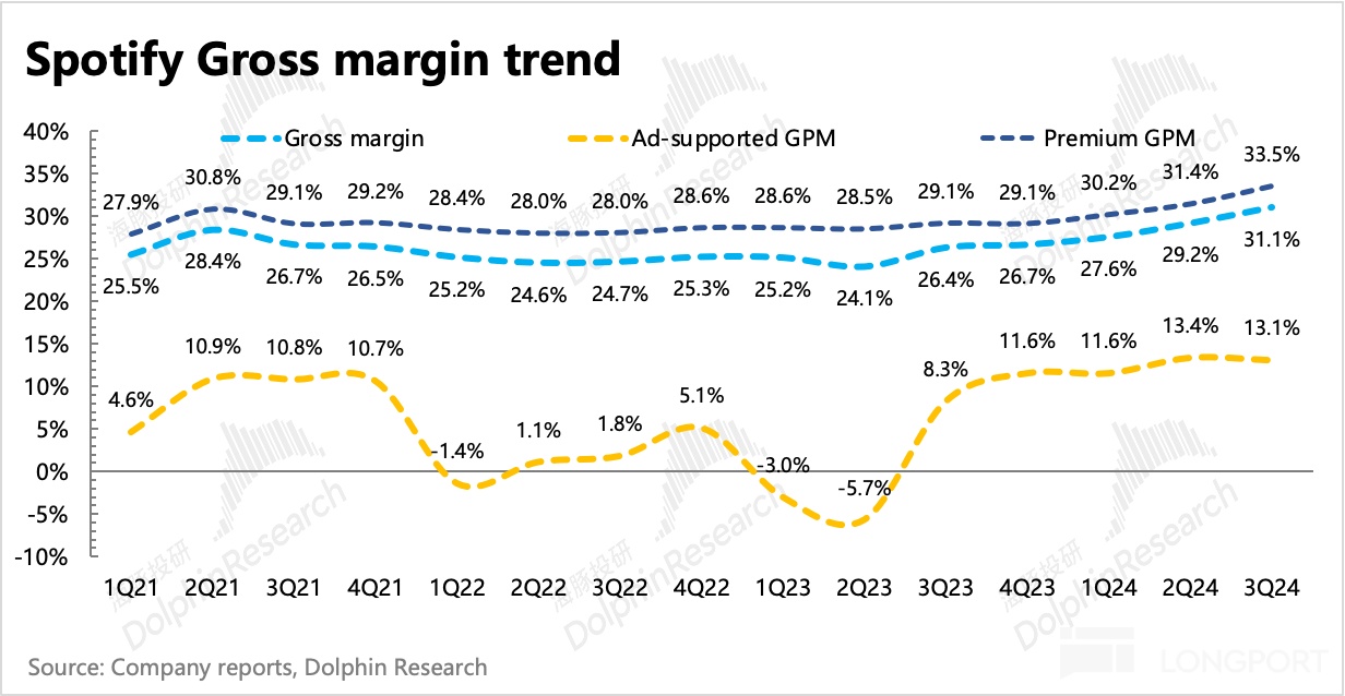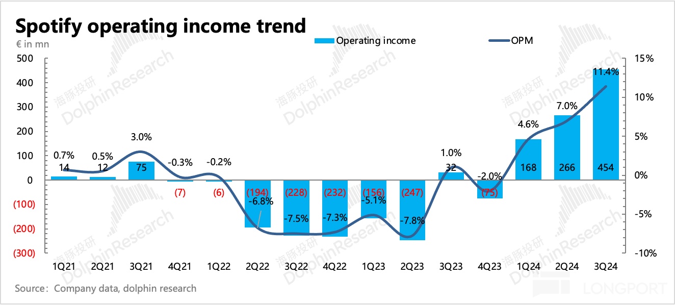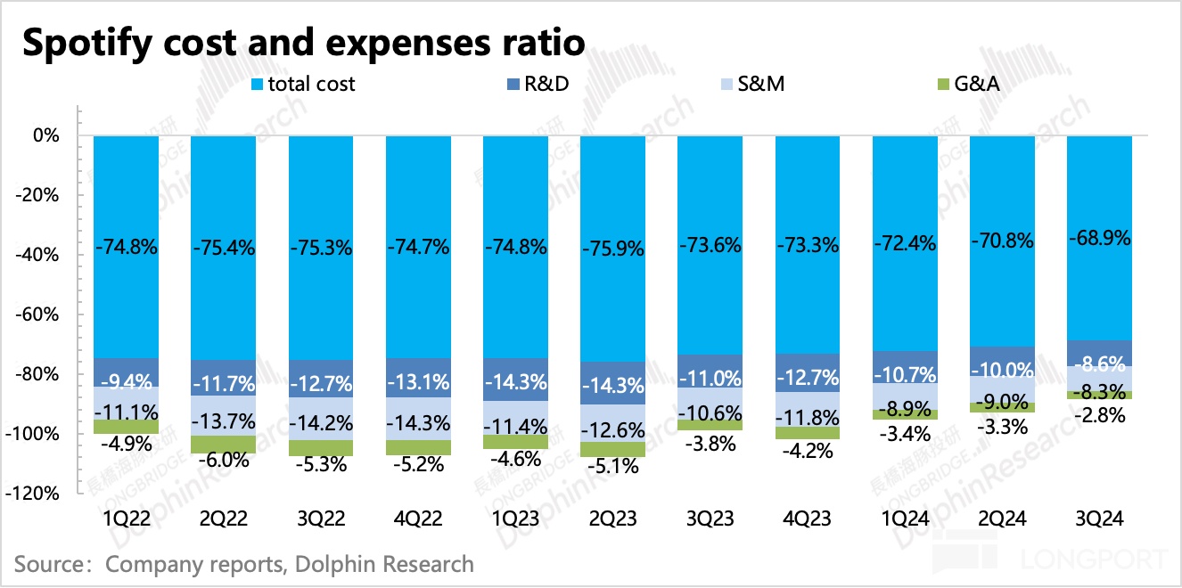 毛利率的稳步提升则主要源自版权成本的优化,上季度海豚君也详细讨论了 Spotify 捆绑套餐对其整个内容成本的优化逻辑和空间,这直接带来毛利率持续稳步提升。