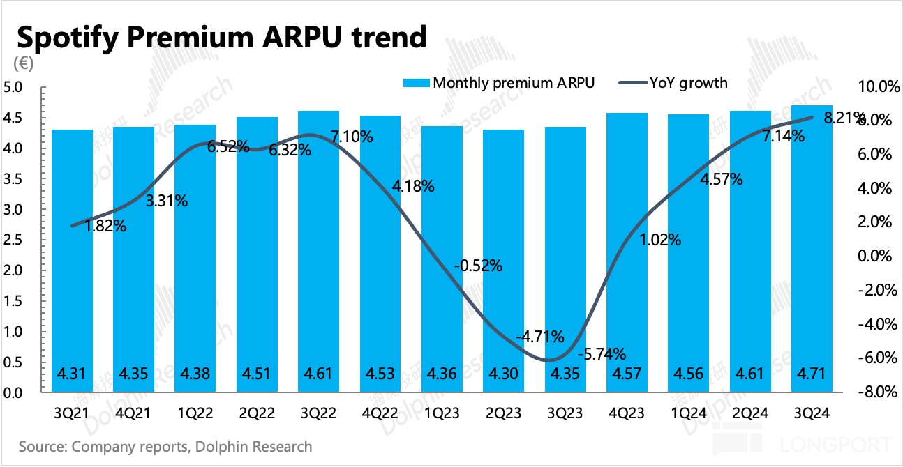 从管理层对 Q4 的收入指引上来看,预计广告端还有一些压力。未来广告收入的增长还得靠播客,音乐的广告套餐用户虽然也不少(Q3 达到 4 亿),但或许因为听音乐的使用场景原因,广告效果一般,人均 ARPU 非常低,远不及付费订阅的变现效率。