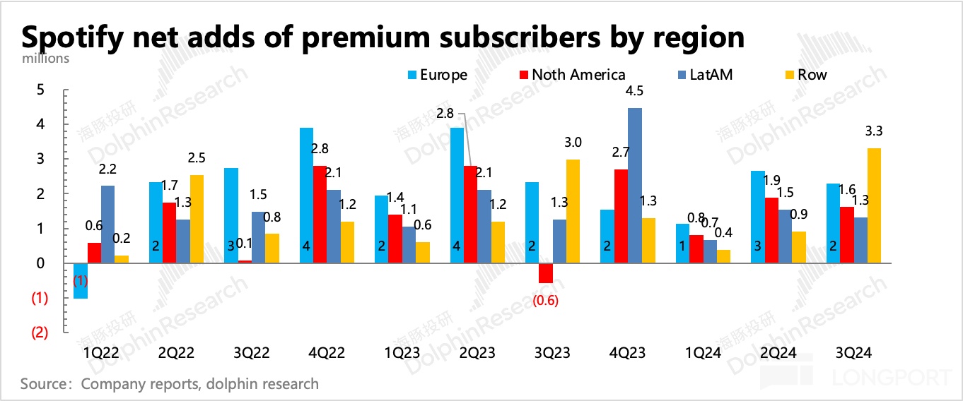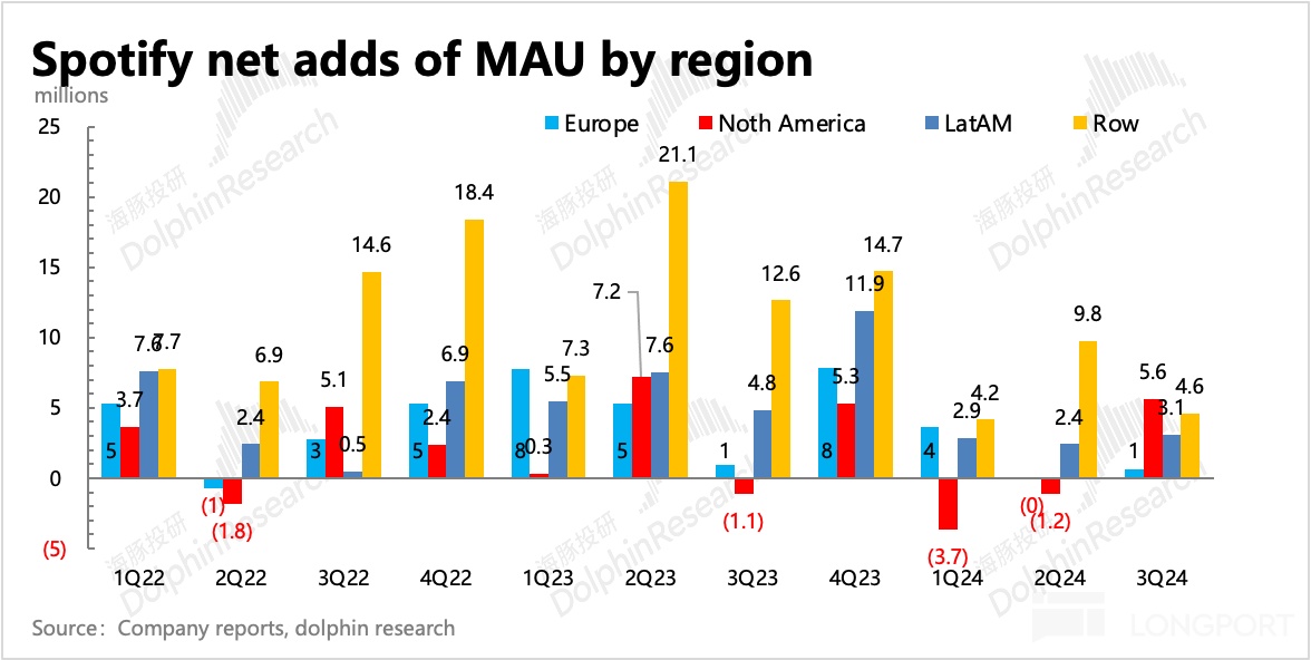 三季度 Spotify 获客 1400 万人,平均月活达到 6.4 亿,增量仍然主要来自于拉美和其他地区。