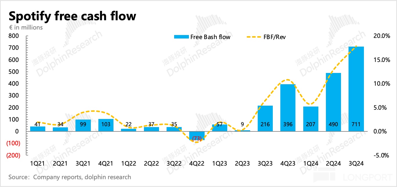 主业盈利提升,自然能够带来现金流的同步改善。而 Spotify 这种预付性质的商业模式,本身也更占优势。尤其是当行业地位稳固,无需太多重度的软硬件、内容投资后,现金流会有一个更明显的扩张。