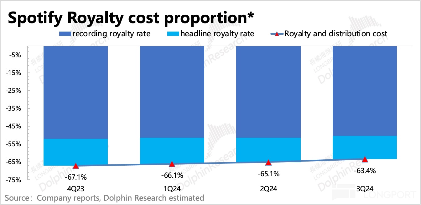 海豚君通过成本拆分,倒算出付费内容的版权成本占比环比继续下降了 1-2pct(估测值)。版权成本主要由付给词曲作者的著作权成本,和付给厂牌公司的录音权成本,两部分组成。