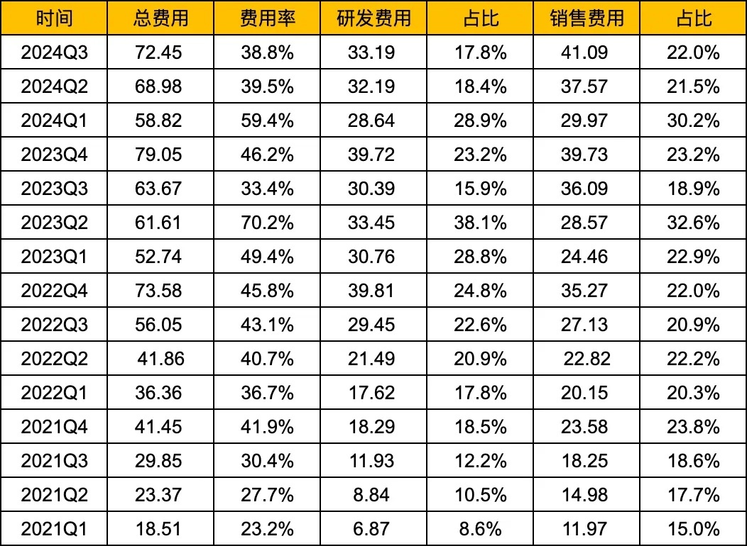 总费用 72.45 亿,总费用率 38.8%;研发费用 33.2 亿,研发费用率 17.8%;行政和销售费用 41.1 亿,费用率 22%。