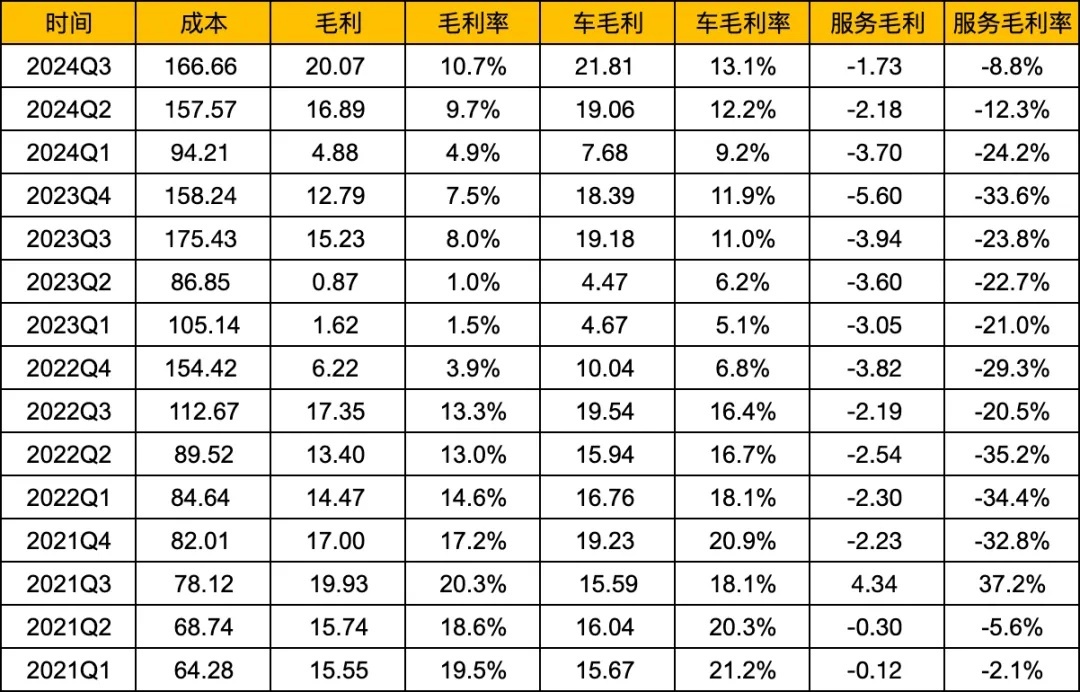 总毛利 20.1 亿,毛利率 10.7%;车辆毛利 21.8 亿,毛利率 13.1%;服务毛利-1.7 亿,毛利率-8.8%。