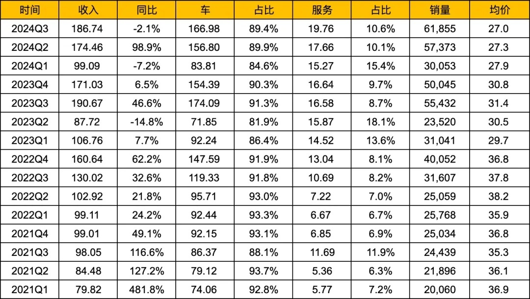 总收入 186.7 亿,同比降低-2.1%;其中车辆销售收入 167 亿,同比-4.1%;服务收入 19.8 亿,同比增长 19.2%。