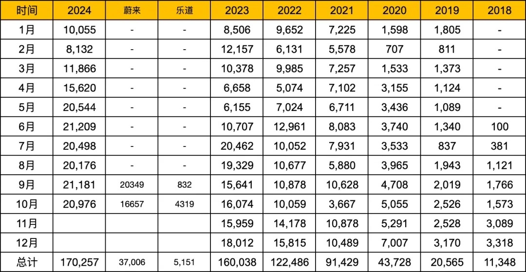 鉴于 10 月份蔚来已交付 20976 台,相当于 11-12 月份需交付 51000-54000 台,相当于 11,12 月份月均交付 25500-27000 台之间。