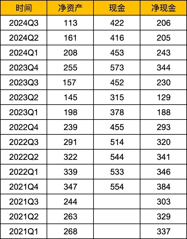 截止 Q3,净资产已经跌到 113 亿;现金储备 422 亿人民币,有息负债 216 亿,净现金 206 亿。
