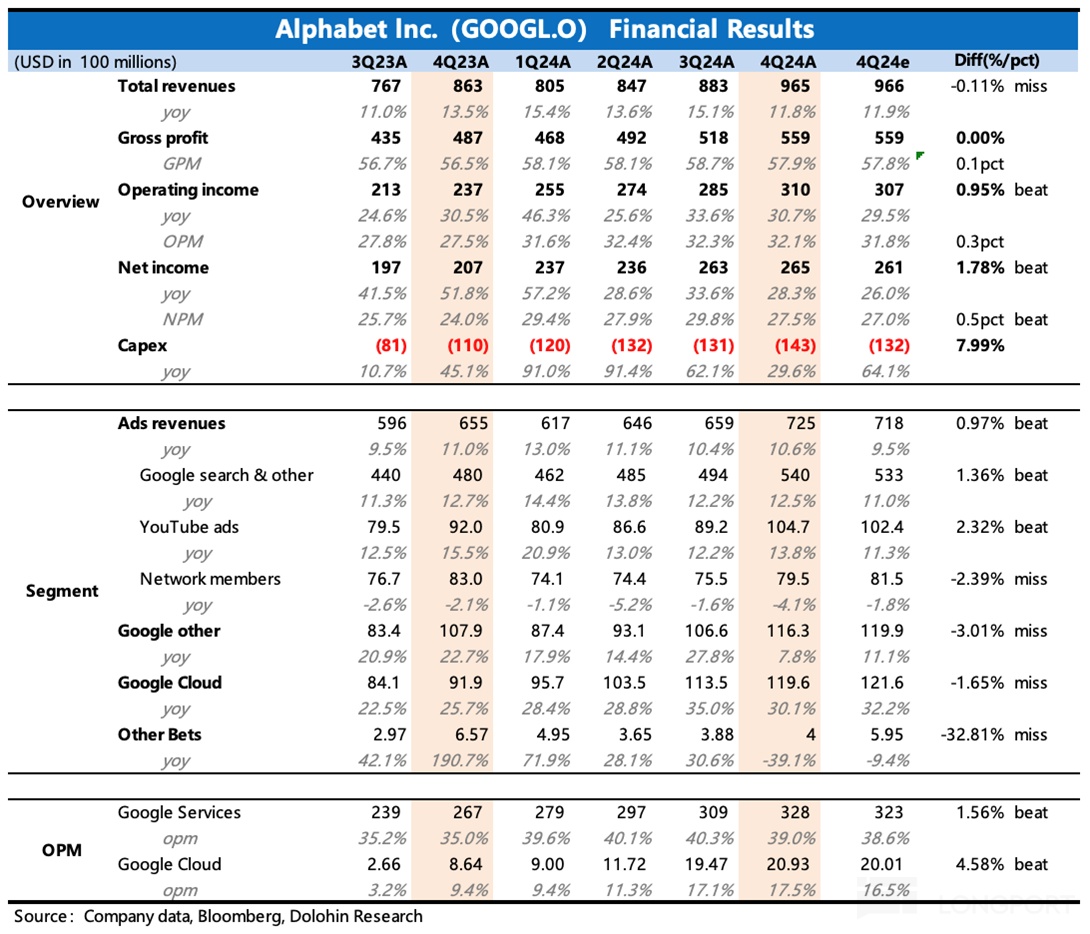 面临挑战:2025 年第一季度,公司收入将受到外汇汇率和闰年两个因素的影响。按当前即期汇率计算,美元相对于主要货币的升值将对收入产生更大阻力;2025 年第一季度比 2024 年第一季度的闰年少一天的收入,也会对收入增长造成一定压力。此外,谷歌服务 2025 年的广告收入将受到 2024 年金融服务领域强劲表现的影响,云服务收入增长率可能因新容量上线时间而波动。