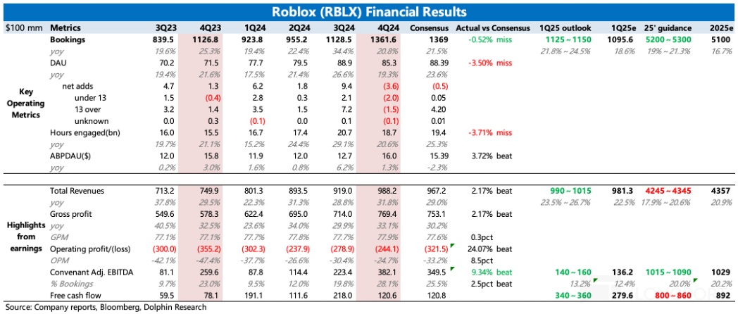 在第四季度,移动和桌面预订量增长了 26%(无高基数影响),预付卡和主机业务在 10 月和 11 月受到了 PlayStation 推出的影响。但 12 月,移动和桌面预订量增长加速到 27%,而预付卡和主机预订量增长了 22%,进入 2025 年一季度之后,增长率仍然保持在 20% 左右。因此剔除 PlayStation 的影响,主机的增长趋势也是保持强劲的。