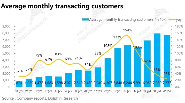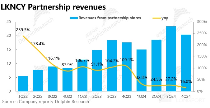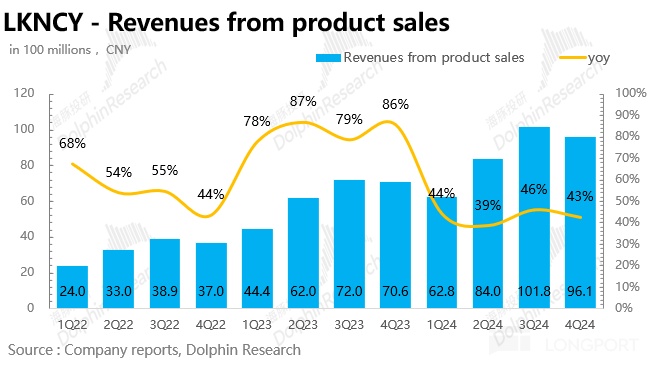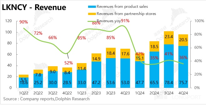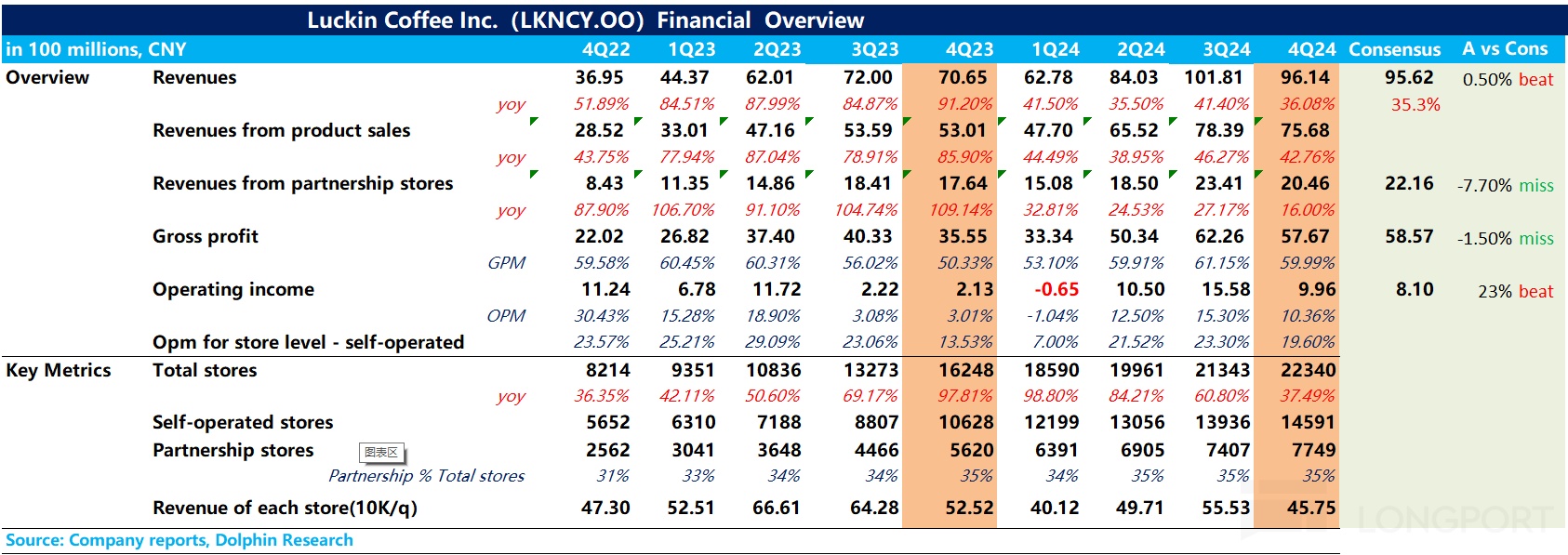 Q4 瑞幸实现总营收 96.1 亿元,同比增长 36.1%,略超预期(市场一致预期 95.6 亿元)。拆分业务来看,自营收入 76 亿,依然在 40%+ 的高速增长中,但加盟因重点区域针对库迪,对加盟商的大力度补贴,收入只是勉强超 20 亿,同比增长只有 16%。