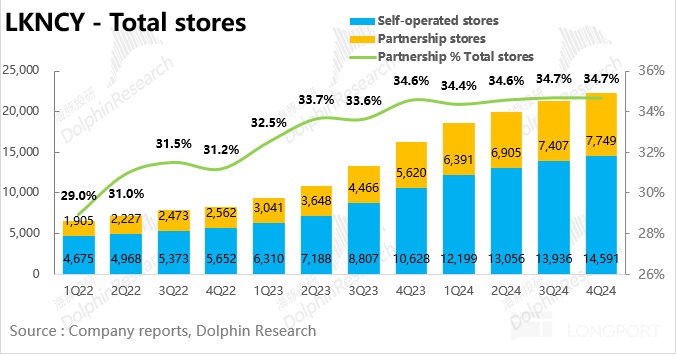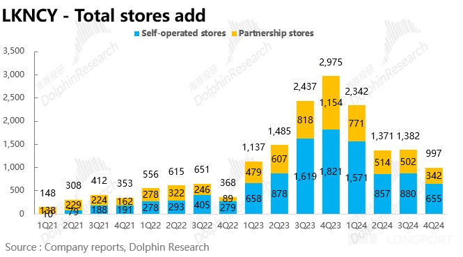 从开店数量上看,瑞幸 24Q4 环比 Q3 净新增 997 家门店,其中自营门店/加盟门店分别净新增 655 家/342 家,增速较 Q2、Q3 持续放缓,接近 2023 年价格战以前水平(为了应对库迪的 9.9 价格战 + 高速开店,瑞幸在 2023 年加快了开店速度抢占优质点位),侧面印证了库迪对瑞幸的威胁在持续减弱