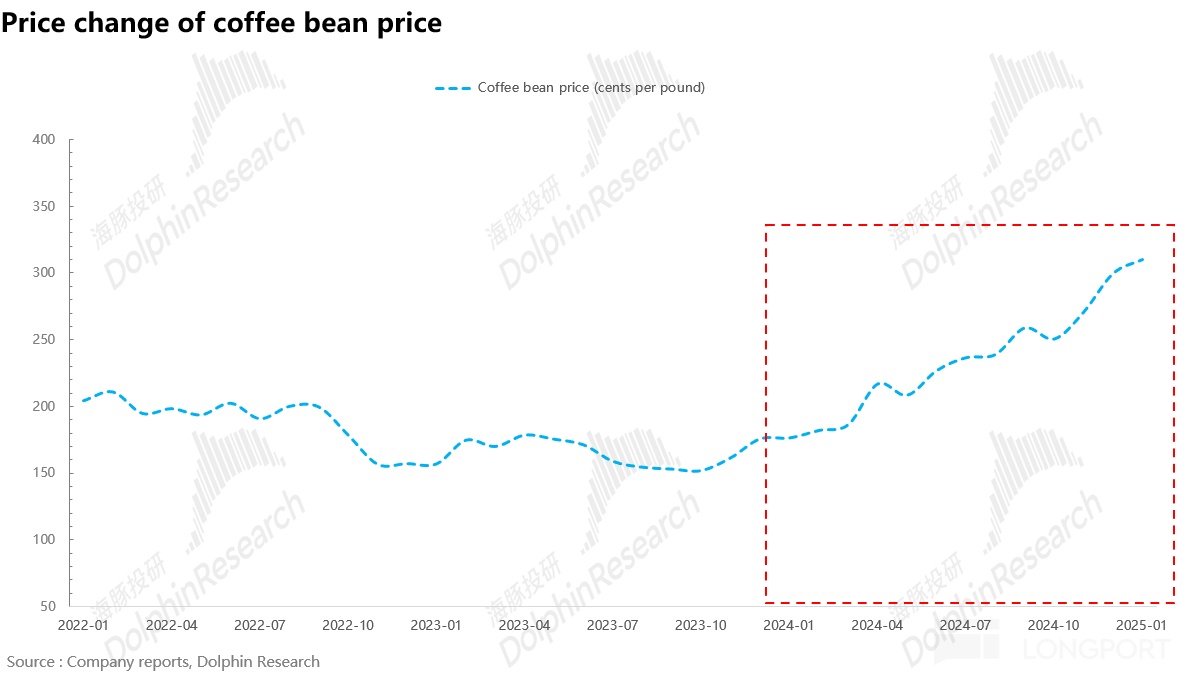 1)逆势降价,缩减加盟商回本周期。原材料上,2024 年初以来,受到极端恶劣天气影响,全球两大咖啡豆主产国巴西及越南咖啡豆均面临大幅减产,咖啡豆产量不及预期使得咖啡豆价格全年飙升 70% 以上。而瑞幸却宣布 2025 年 1 月开始,加盟商从瑞幸采购的咖啡豆价格下调 16.8%,此外,椰浆、纯牛奶等其他 86 款原料也相应有所下调。
