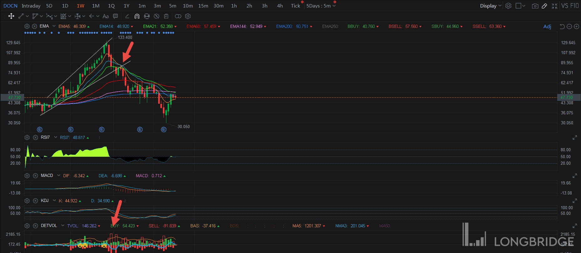 这点从 ZM 的周线图就可以看出,ZM 是 2020 年牛市的领涨股,周线图显示股价在达到顶点时,放量出货的迹象 (DETVOL 指标出现红色空心绿柱) 非常明显。