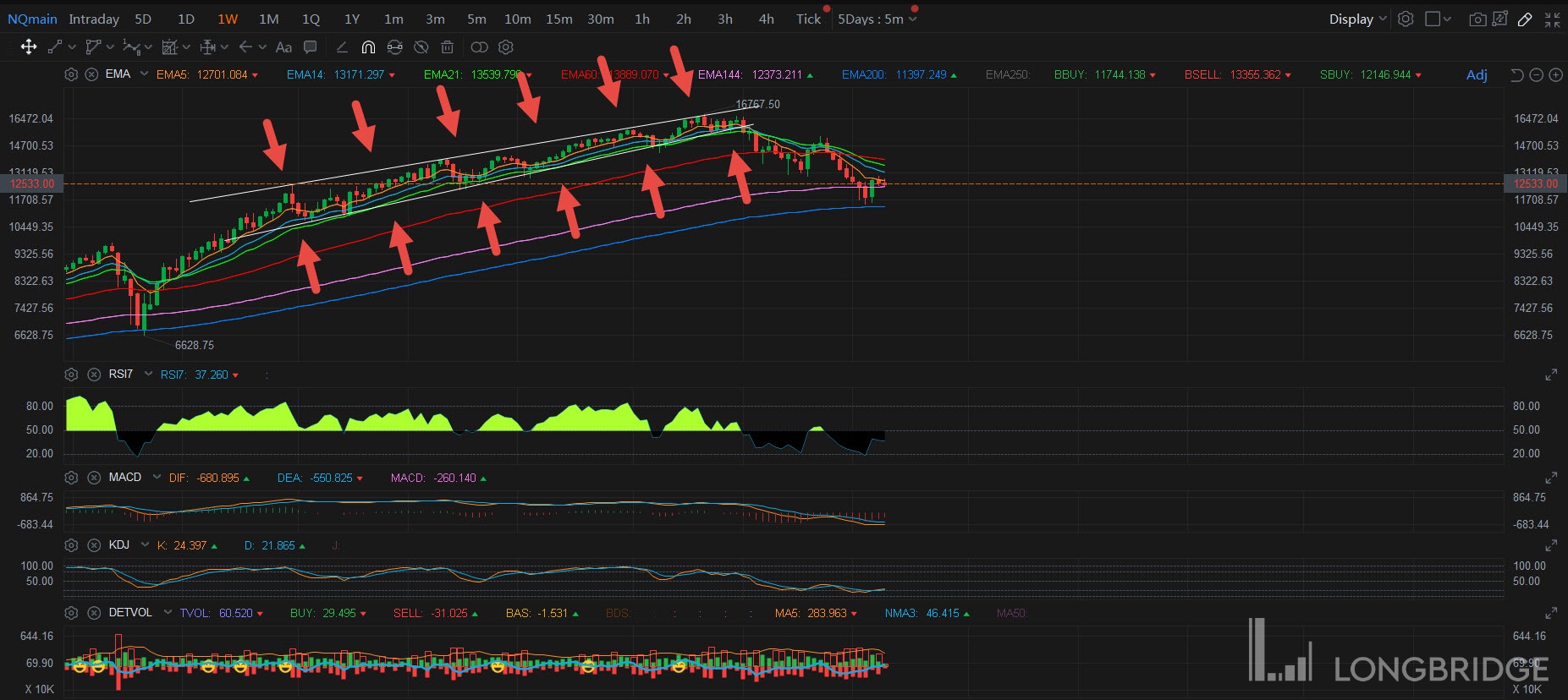 这里建议使用周线图观察价格行为。因为股价下跌的速度远远大于上涨的速度,选择时间框架较短的图表容易被假信号欺骗。