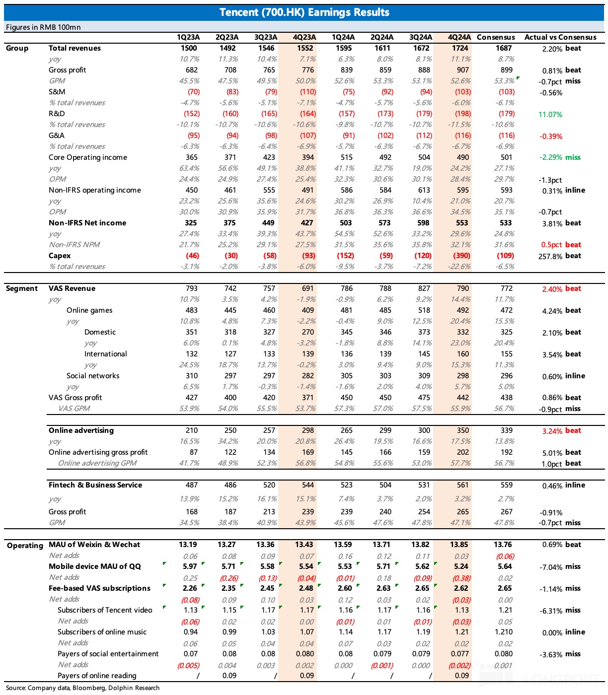 以下为$腾讯控股(00700.HK) $腾讯控股(ADR)(TCEHY.US) 4Q24 业绩电话会纪要,财报解读可参考《腾讯:为 “AI” 痴狂,这样的股王是爱是恨?》