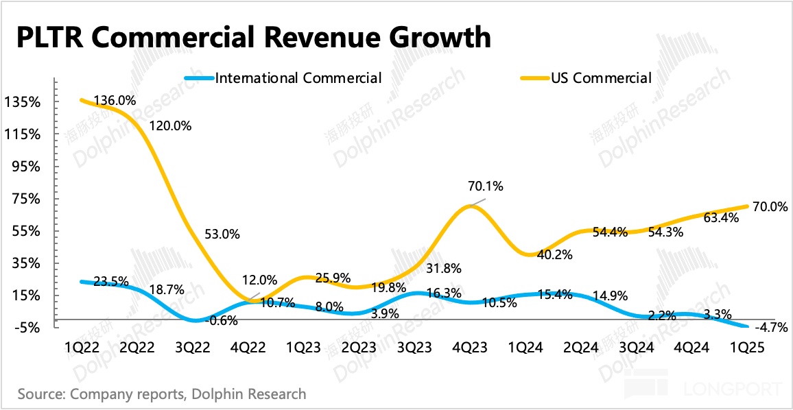 商业国际化不涉及国家安全,一直是被重点寄予希望未来能够长期持续增长的方向,尤其是 AIP+Foundry 的捆绑产品力碾压全球同行的情况下。因此,一季度收入同比下滑,可能是市场最不满意的地方。