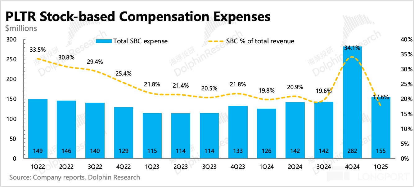 一季度 Palantir 实现 GAAP 下经营利润 1.76 亿,或因更多的 AI 投入在当期得到确认,一季度毛利率同比有所下滑。研发、销售费用继续维持在 20% 以上的同比增长,但仍然低于收入增速。真正做了明显支出控制的,主要在管理费用上。上季度异常的 SBC,一季度恢复正常。