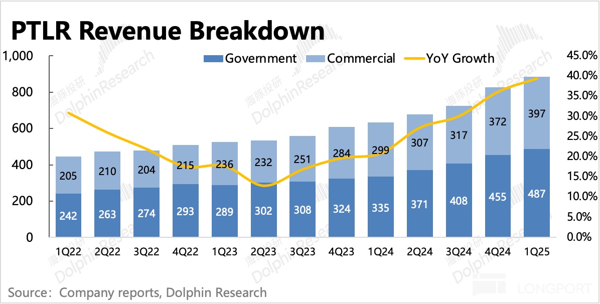 Palantir 前两月的深度调整,主要源于政府 DOGE 的影响,2 月国防部长更是扔下了一枚炸弹:未来国防部门开支将每年减少 8%。市场立即对美国政府收入占比高达 40% 以上的 Palantir,引发了收入增长的担忧。